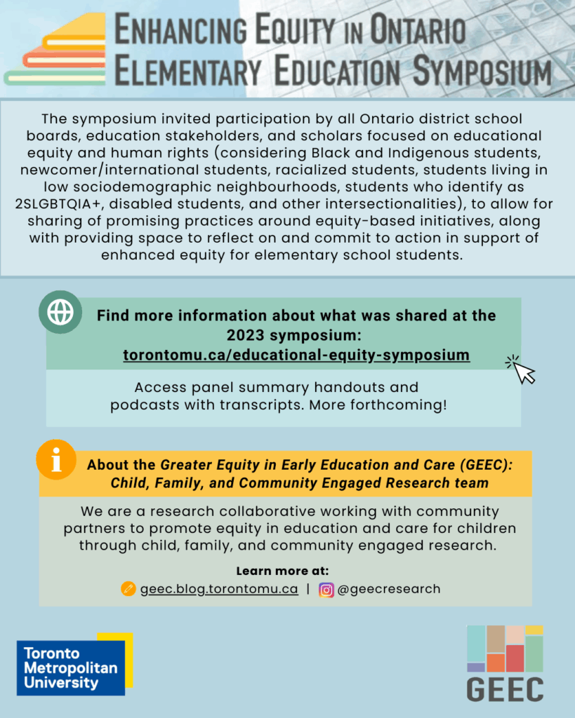 The 2023 Enhancing Equity in Ontario Elementary Education symposium invited participation by all Ontario district school boards, education stakeholders, and scholars focused on educational equity and human rights. The hybrid symposium included over 300 participants and created space for reflection and sharing of promising practices around equity-based initiatives, in support of enhanced equity for elementary school students.