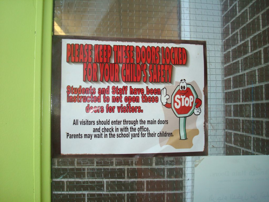 Safety signs posted outside school doors in the redeveloping neighbourhood.